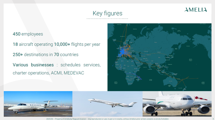 Amelia is a French aviation group created in 1976. As figure 1 shows, we have about 500 employees and a fleet of 18 aircraft operating across Europe and Africa. Our activities cover scheduled flights, ACMI operations, charter services, and medical evacuations.