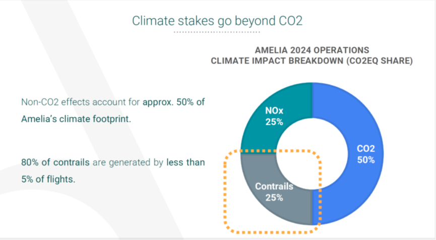 At Amelia, we decided to go beyond CO₂ tracking and address the full climate impact of our operations. Since 2021, we have run analyses to better understand non-CO₂ effects, including NOx emissions and contrails, both of which can significantly amplify warming. Considering both together, an airline’s total climate footprint can nearly double, making this a critical area for action.