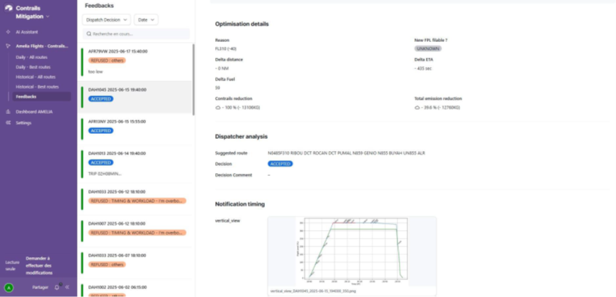We also track acceptance reasons. For example, if a proposed plan is not flown, we record whether it was due to operational or ATC reasons. Optimization details are included: in one case, a descent from FL350 to FL310 (40 feet) was expected to save 13,000 kg of CO₂. This information is visible to OCC dispatchers, who can approve or decline the plan.
