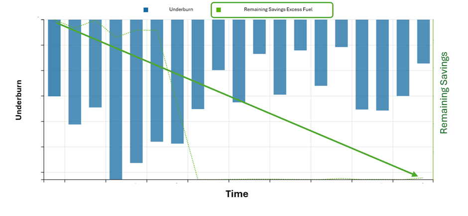When implementing any fuel efficiency initiative, a thorough risk analysis is essential to ensure that the policy remains safe, practical, and operationally sound. A recent example is the optimization of excess fuel for selected destinations, which was refined after StorkJet’s data-driven analysis demonstrated it could be safely adjusted. This approach ensures that efficiency gains are achieved without compromising the safety or integrity of the operation. The remaining savings then showed the Remaining Savings decreased to 0kg per flight as seen in figure 3.