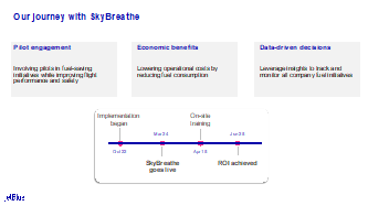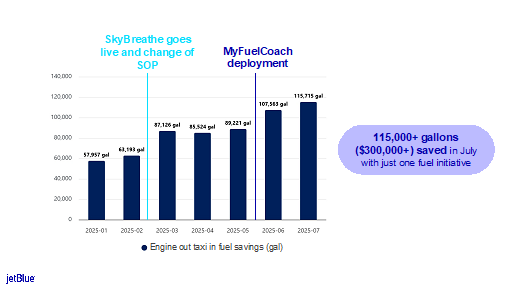 I was astounded to see the change from February as we progressed through our new SOP and the launch of SkyBreathe® MyFuelCoach. In March, we started to go live, and by late May and early June, we had launched the app to the entire pilot group. We went from 19 percent to 45 percent engine out taxi out compliance and saved nearly 2,000 tons of fuel in six months with SkyBreathe® MyFuelCoach. It makes an incredible difference in how pilots operate aircraft on a day-to-day basis, with single engine taxi, both in and out. It is a huge opportunity for saving fuel and to see such a drastic change in performance is wonderful.
