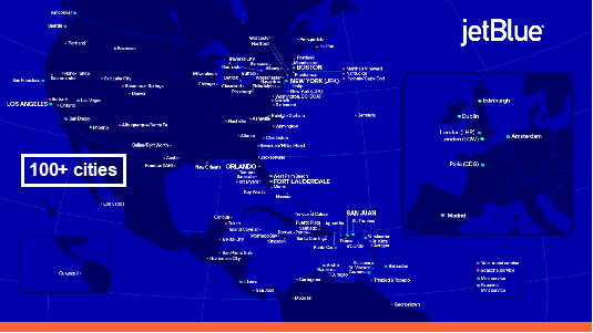 As figure 1 shows, we now serve over 100 destinations in North America, South America, the Caribbean and Europe. The VFR (Visiting Friends and Relatives?) market on the East Coast is our bread and butter, with transatlantic expansion a recent focus, along with growth in the greater Boston area.