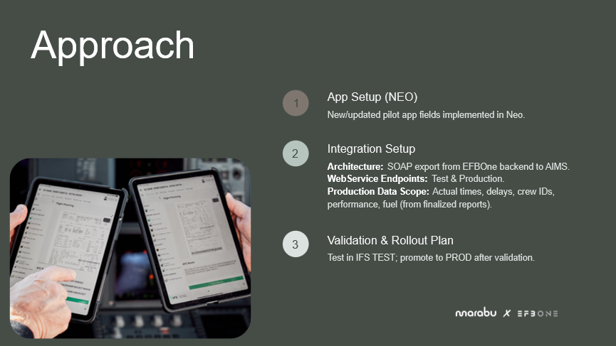 Leading the Marabu Flight Operations IT team, I had previously completed the four-day EFBOne Administrator Training provided by IFS. The training gave me hands-on experience with EFBOne’s self-service admin tools, including NEO, EFBOne’s no-code configuration tool, which allows EFB administrators to configure the system to their specific needs, and the export back-office interface. Using this knowledge, I was able to add new fields and Lua conditions, a lightweight script that define rules and logic within EFBOne, with minimal support from IFS. Based on this expertise, we mapped out the steps needed to ensure data from EFBOne would flow accurately into AIMS, setting the stage for the solution approach.