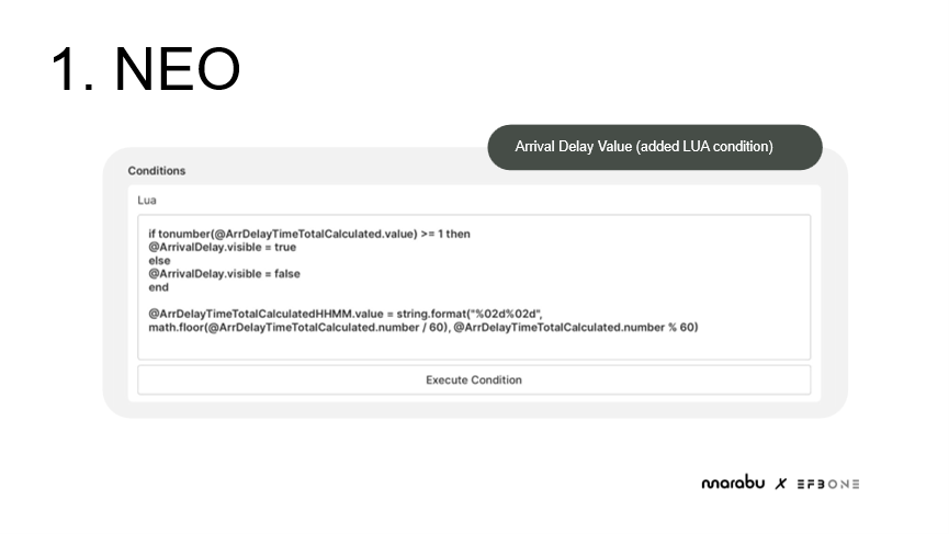 At first glance, the setup in NEO may appear complex, but the training made it easy for the team to understand and apply it effectively. Lua, a simple scripting language, in combination with training, enables non-IT specialists to implement and modify configurations with ease. We added a Lua condition to handle delay times and adapted other fields to ensure the data would be correctly interpreted by AIMS. This specific syntax was created to export delay times in a format that AIMS can understand, with the final line of the syntax converting minutes into hours.
