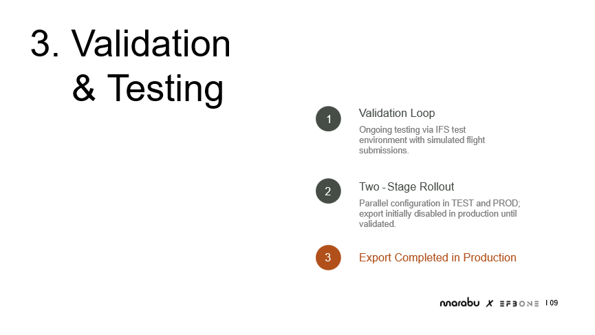 The final step was to validate the export process before going live. The validation loop is ongoing testing in the IFS test environment using simulated flight submissions. This allowed testing that all data flowed correctly from EFBOne to AIMS, without affecting production operations. Once that testing confirmed accuracy, we implemented a two-stage rollout. The configuration ran in parallel configuration in both the Test and the Production environments, with exports initially disabled in Production until fully validated. This approach ensured that both environments behaved identically while minimizing the risk of errors, and without disrupting actual operation. Finally, the export was promoted to Production, fully deploying the tested configuration.