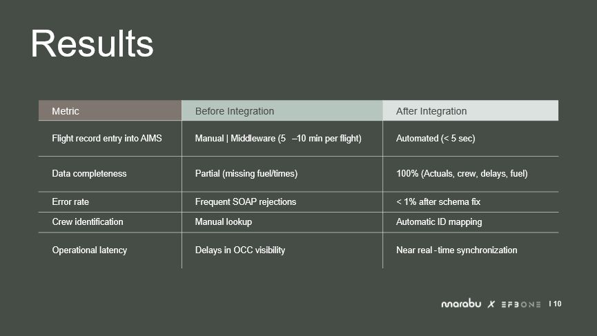 Error rates were another key area of improvement. Previously, SOAP rejections occurred frequently. SOAP will not accept partial data, only the entire dataset. Any input error would cause the export to AIMS to fail. After implementing the redesigned export logic and schema fixes, the rejection rate dropped to below one percent. Before the integration, crew details were verified through manual lookup, the system now cross-checks crew data automatically between flight planning, EFBOne, and AIMS. Operational latency was reduced from delayed OCC visibility to near real-time synchronization. Flight data is now available across departments instantly after submission.