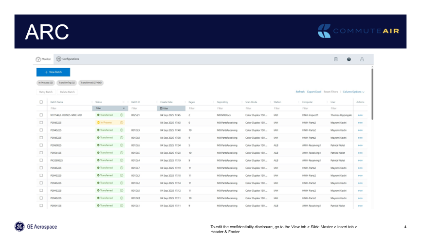 In 2023 we had GE Aerospace’s system but didn’t know what we were doing with it. We were going through all the steps but didn’t know what we were getting out of it; we wanted to know what we could do to get where we needed to be. The GE Aerospace team responded quickly, and we met to strategically map out a path to get there. GE Aerospace worked to resolve all issues that we raised and the challenges we had identified. For three years prior to 2023, we had been working with network drives and SharePoint drives at all locations where we were manually scanning, so that we could have access to records. The challenge with that was that, while anybody could scan to that network drive or to the SharePoint drive those scans were not searchable; there was no keyword search. Although it worked, it was hard to audit. We also ran into scanner jamming problems as the system grew; the more we were putting in, the more trouble there was, which made us wonder how, in the future, we would be able to answer regulatory questions about shredding paper. That’s when we started working with GE Aerospace. There have been challenges but CommuteAir has been fully utilizing GE Aerospace’s ARC (Asset Records Capture) since July 2025.We have stopped using the third-party application, just leaving them on a couple of computers, in case.