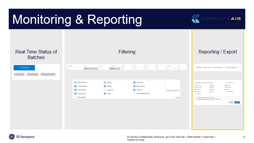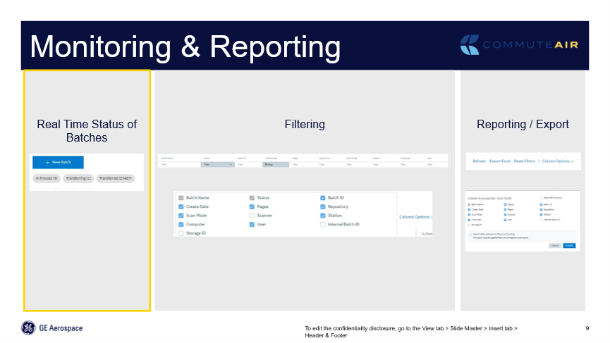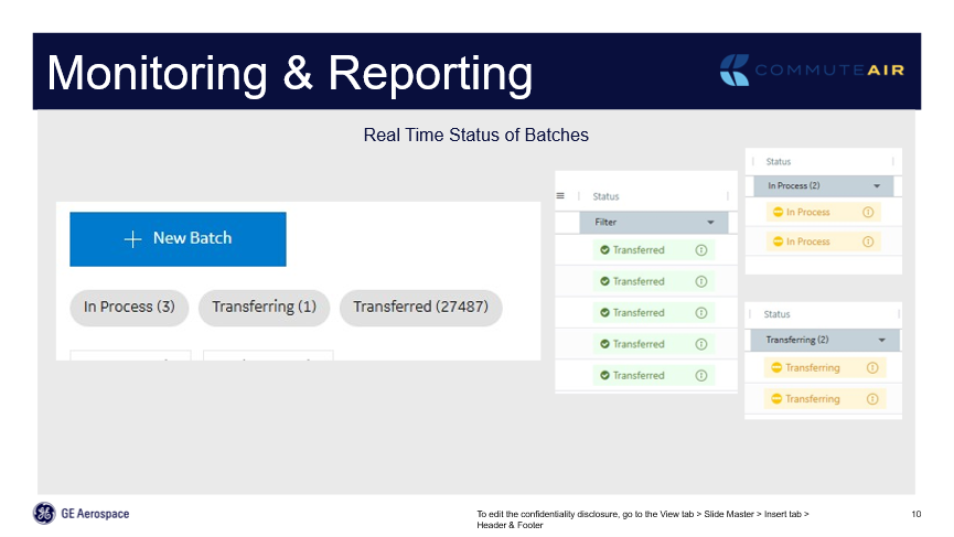 On the right of figure 6.2 are the different statuses; ‘Transferred’ means it moved right through to the next step. ‘In Process’ shows a user is currently scanning a batch, that’s how detailed the system is. I can see this user is in the middle of scanning a batch right now. ‘Transferring’ means that it’s in the process: the system is reading those documents, moving them to the correct repository, and looking at that information. On the left side of the figure, you can see just a grab from the dashboard; In Process, Transferring and Transferred. Users don’t even have to scroll through the whole list for the organization but can immediately see that there are three batches in process and one batch in transfer. Clicking on any one of those buttons, take the user to every batch that’s in that current status. From there, a user can drill in to see the scanning location and the user, to start determining whether it’s a station issue, a user issue or a GE Aerospace issue. 95 percent of scanning halts and stalls have been user issues.