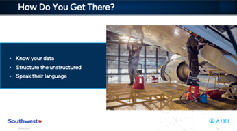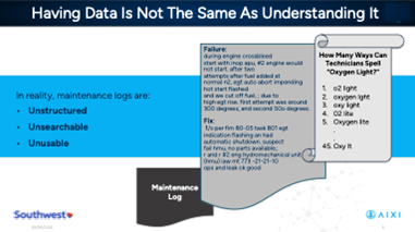 Southwest is committed to providing our aircraft maintenance and reliability teams with the most accurate data and advanced tool sets to optimize their efficiencies and effectiveness. Our journey to do that began with the reliability team, which I lead, and the data that helps us improve our fleet’s mechanical reliability and ensure compliance with our approved maintenance program. Southwest has built a product with AIXI that extracts value from previously unstructured data and maintenance logs. We continue to build tools that work on top of this data to extract information and deliver it to the right users.