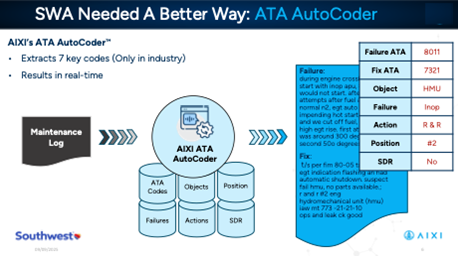 At Southwest, we needed to access and understand our maintenance data before we needed another dashboard. We wanted to make sense of the unstructured data and apply standardized ATA coding, as well as additional key descriptions of the aircraft’s component/system, how it failed, and how the defect was resolved. AIXI’s ATA AutoCoder became foundational to our reliability program and the tools that we could build on top of it.