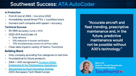 This case study highlights how Southwest is using AI-enabled tools to extract strategic value from its maintenance records. It was also the subject of a joint presentation by Barry Lott and Cameron Byrd at the Airline & Aerospace MRO & Flight Operations IT Conference in late 2025.
