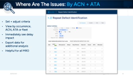 Repeat problems present another key area to tackle. AIXI’s Repeat Defect Identification tool (Figure 5) allows team members to select parameters, such as duration, the number of defects, specific ATAs, and fleet type, to get insights on top repeat and reliability issues. By ranking and weighting items based on an airline’s criteria, teams can immediately focus on the top problems and escalate if needed.
