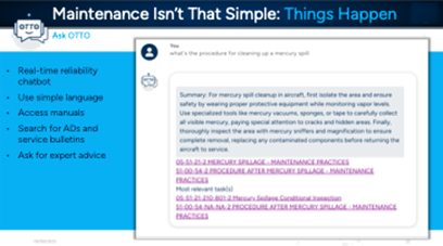 Among AIXI’s most exciting tools is one that can interrogate an airline’s data using simple natural language queries. Ask OTTO, AIXI’s real-time chatbot agent, is armed with dedicated information from an airline’s maintenance records, manuals, and other data sources. Ask OTTO can answer questions to jump-start an analyst’s work or support a technician in a critical moment. The example in Figure 7 shows the AMM links to the procedure for cleaning up a mercury spill, delivered in seconds, removing the laborious task to search through manuals.