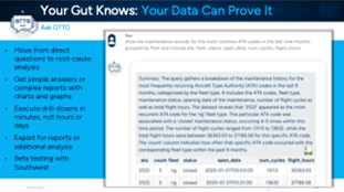 Ask OTTO also handles more complex questions, ones that could take an analyst a full afternoon or even days to answer. Figure 8 shows Ask OTTO providing a summary of the most common ATA codes in the last nine months, grouped by fleet. The result is a data snapshot and summary, plus the ability to download the data for additional reporting, graphs, or analysis.