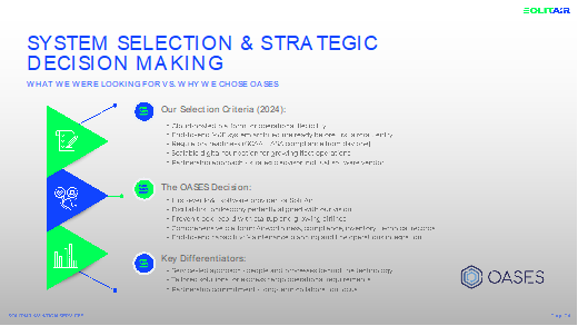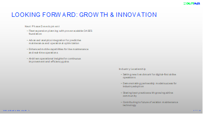 With training and implementation completed, our phased launch began in August 2025 with a full go-live in September, achieving the first complete maintenance cycle with zero disruptions. I would highlight here the synergy between the SolitAir and OASES teams, with everyone focused on a common understanding and shared KPIs. We were impressed by OASES’ responsive account management and continuous enhancements to the system based on operational learnings and our feedback. In effect, OASES is an extension of our operations team.