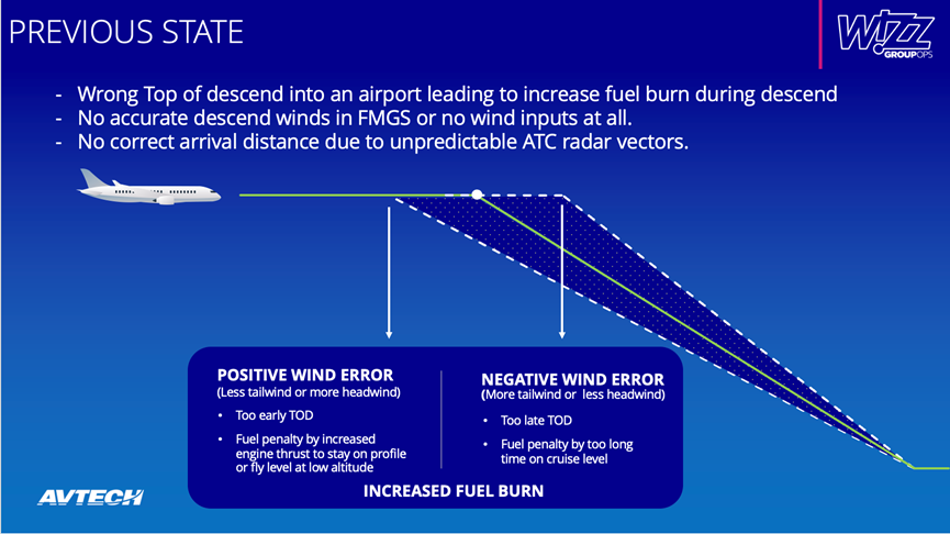 The focus of this case study is the commitments Wizz Air has in reducing fuel burn on descent and how we are working in partnership with AVTECH to solve them using real-time wind data uplinks to the FMC (Flight Management Computer). Up to 5.8 million euros in cost savings can be achieved by implementing improvements, as demonstrated by the results included here.