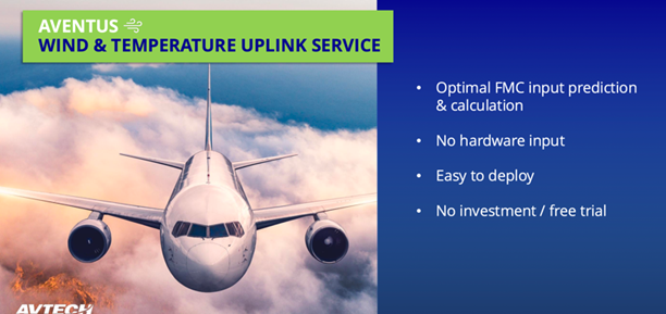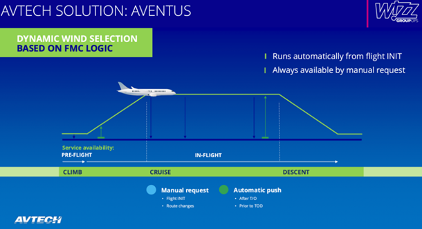Shortly after take-off, Aventus automatically uplinks real-time wind data to the flightdeck FMS. Prior to top of descent a new automatic uplink is communicated with fresh optimized dynamic descent winds. This ensures that pilots continuously receive the latest optimized wind information during cruise and descent thus supporting an improved flight optimization and enhanced operational performance.