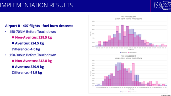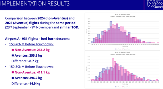 Getting the right data in all areas is the key to greater fuel efficiency on descent. By programming FMGS correctly especially getting the correct distance to touchdown, pilots have greater fuel efficiency on descent. That is why education and pilot training was essential to Wizz Air’s rollout of Aventus. We hold regular online discussions with our pilots to educate them about Aventus and to pass on the key message that fuel savings benefit the environmental targets as well.
