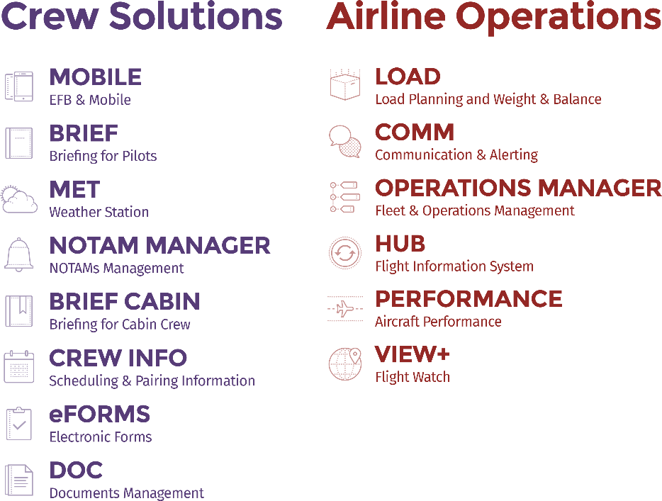 - EFB & Mobile solutions for Pilots and Cabin Crew – Dedicated iOS iPad (EFB) application supporting pilots and cabin crew with briefing packages, navlogs, weather and NOTAMs, fuel ordering, calendars, rosters, operational manuals, electronic forms, messaging, seat maps, and mobile map.
